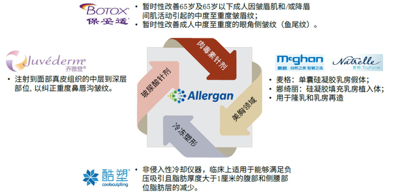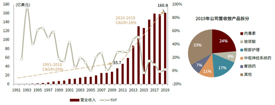 营收构成:产品线齐全,大单品表现强势。按产品拆分,2019年公司肉毒素/玻尿酸/滴眼液/中枢神经系统药收入占比分别为24%/8%/17%/11%,并不依赖单个产品。其中,公司医美两大拳头产品,肉毒素产品保妥适(Botox)、玻尿酸产品乔雅登(Juvederm)快速成长,占公司总收入比重由2015年的11%提升至2019年的18%,是公司业绩增长的重要驱动力。具体来看,医美版肉毒素保妥适2019年实现营收16.6亿美元,2015-19年对应CAGR达17.9%,以终端销售口径计算,其2018年在全球医美肉毒素市场占有率达65%,为全球最为知名的肉毒素单品;玻尿酸产品乔雅登2019年实现营收12.4亿美元,2015-19年对应CAGR达21.3%,出厂口径计算全球市占率约6%。
