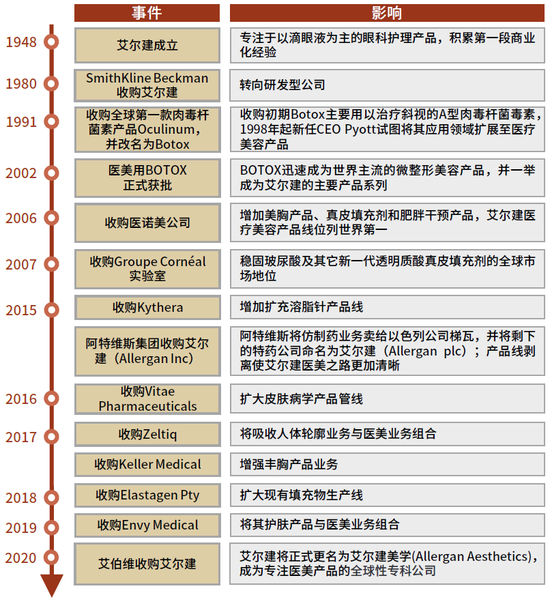 数次优质标的收购,助力艾尔建完善医美产线布局。自90年代起,艾尔建通过数次优质标的收购,逐步扩充医美产品管线,包括1989年收购Oculinum掌握肉毒素核心技术,2007年收购Groupe Cornéal实验室巩固透明质酸市场地位,此外艾尔建亦是通过收购对美胸、溶脂、塑形等医美领域展开了全线拓展,体现了其前瞻性布局。