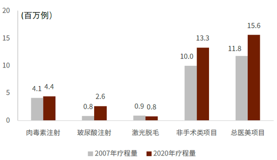 图表:美国医美疗程量结构(2007 vs 2020)