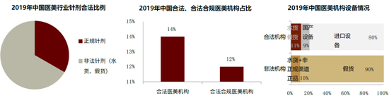 ► 医疗器械方面:2019年我国医美行业正规针剂占比仅为33%;合法机构中“水货”/假货器械分别占比10%/1%,非法机构中假货器械占比高达90%。
