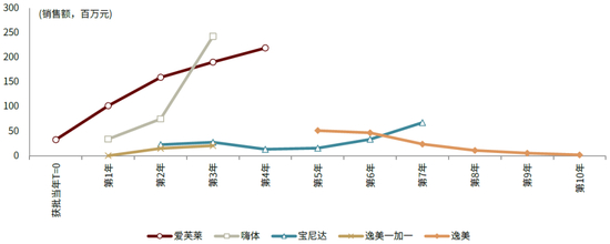 ①销售额:以牌照获批为起点,玻尿酸注射针剂首年的销售贡献通常在五千万元以内,经过1-2年的培育周期,有望进入快速成长的放量阶段,但定价较高、注射难度较大的长效类产品(如宝尼达)培育周期较普通玻尿酸产品显著更长;进入第7-8年,随着竞品进入导致市场竞争的加剧,以及产品自身迭代升级,其销售可能进入衰退周期,例如爱美客旗下逸美作为2009年推出的一款产品,2016年,爱美客推出“逸美一加一”作为迭代升级款,使得2017年以后,逸美的销售额明显收缩;