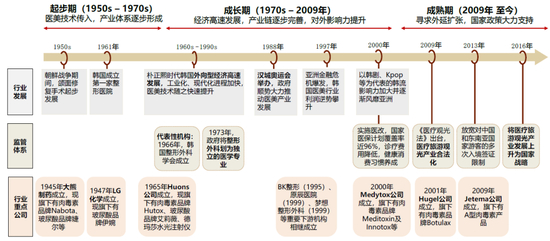 ► 萌芽起步期(1950s–1970s):龙头药械企业相继创办,产业链上下游初具雏形。朝鲜战争后,整容外科技术开始传入韩国;这一阶段,整形医院及大熊、LG等头部药械公司相继成立,整形外科行业协会亦创办落地,产业链上下游初步成型;1973年韩国将“整形外科”作为医学专业,标志着行业发展在监管层面迈上新台阶。