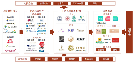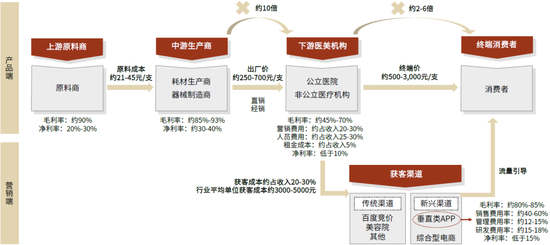 沿产业链构成自上而下拆分,我们将医美产业链划分为上游原料供应商,中游药械生产商/仪器设备供应商,下游医美服务机构,以及获客渠道四个环节。