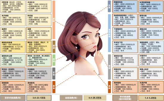 注:灰色边框项目为非手术类项目,红色边框为手术类项目,手术类项目年消费按20年折算;项目报价参考新氧,统计时间2021年5月