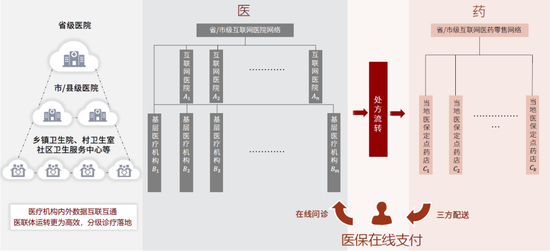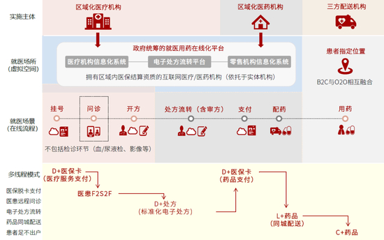 院内终端购药场景演变:新冠疫情期间,国家为解决以慢病患者为代表的非新冠患者难以及时满足基本就医需求的问题,“医+药+险”全链路在线化模式在部分省市初步落地。以省/市级统筹互联网医疗服务平台为例,符合条件的患者通过当地互联网医疗服务平台实现远程复诊续方,同时药品配送到家,整个就医购药流程通过移动端完成。