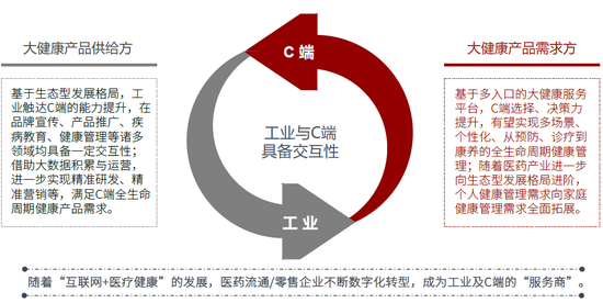 我们认为,随着生态型发展模式的不断普及,传统供应链环节也将迎来数字化升级,未来流通与零售有望一体化融合,使得数字化供应链具备2C场景,进一步提升工业触达C端的能力(在品牌宣传、产品推广、疾病教育、健康管理等诸多领域具备一定交互性)。