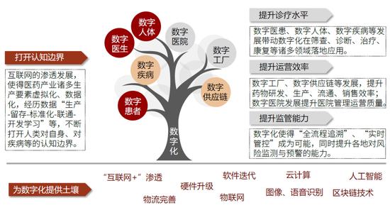 我们的核心观点:“互联网化”使得医药产业核心要素数据化,大量数据的生产、沉淀与联通催生诸多数字化应用场景在医药产业落地。我们认为,数字用户、数字医生、数字人体、数字医院、数字疾病等的发展有望不断打开认知边界,进而全面提升诊疗水平、产业运营效率、监管能力。我们认为,未来随着物联网进一步发展,医药产业有望进入科技赋能、全面跨界共融的大健康时代,医药产业各方均需要应势战略升级,提升数字化能力。