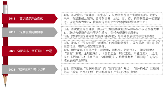 2021年,我们首次提出“互联网健康”向“数字健康”升级,“医+药+险”互联网化向大健康“服务+产品+支付”数字化升级,医药产业进入科技驱动、跨界共融时代。