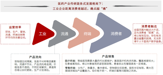 纵观整个医药工业传统产业链,在“互联网+”尚未渗透、物流体系尚不完善的阶段,从工业到终端明显受制于物理空间束缚,出现区域间诸多信息不对称、不透明等痛点,流通、零售等环节分散,药品铺货和动销能力弱,工业企业对消费者画像几乎是缺失的。
