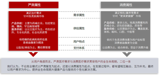 特殊性:“消费方/决策方/支付方”三方互异对应“医+药+险”需求三位一体,除了考虑人、货、场,还需考虑医、卡、方