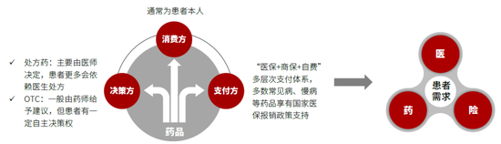 图表:医药产业具特殊性,“消费方/决策方/支付方”三方互异对应“医 + 药 + 险”需求三位一体