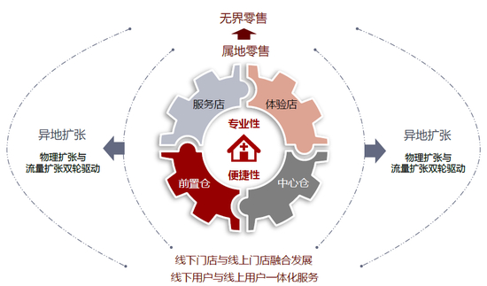 从门店布局上,我们认为,中心仓与前置仓的协同发展有望成为趋势,加速B2C与O2O模式融合为同城零售;服务型门店更多位于社区与院边,强调有温度的专业服务力;体验型门店更多位于客流量大的商圈,成为创新服务、产品与模式的发布与体验中心。