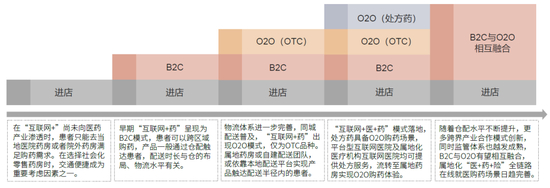 从“药”的角度:B2C模式在全国范围匹配患者用药需求与网上药店产品供给;O2O模式在同城范围匹配患者用药需求与网上药店产品供给;产品通过仓配或店配触达患者。