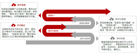“互联网+医疗健康”的发展起源于患者就医购药流程的单点需求“互联网化”,早期典型代表有:以在线挂号、在线问诊等为主的“互联网+医”模式,以医药电商为主的“互联网+药”模式,将患者挂号、问诊、买药等单点需求突破时空束缚,实现在线化,但是“互联网+医”及“互联网+药”的独立发展使得患者出现“诊药分离”现象。2017年,随着国内物流体系不断升级,配送效率越来越高,医疗、医药、运力等多方开始联结,以患者需求为中心实现功能融合,药品以仓配或店配形式触达患者,“互联网+医+药”模式出现,但依然未满足患者“医+药+险”三位一体需求。