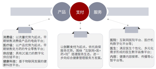 我们认为,对于生态型发展模式而言,最终目标多为以C端用户为中心,提供全生命周期的个性化健康管理解决方案。但是生态模式的发展起点具有差异性,有的从“药”切入,有的从“医”切入,有的从“险”切入,然后围绕患者搭建完整的生态。从健康属性上看,有的以严肃属性为起点(例如互联网医院、专业化零售等,看重专业服务),有的以消费属性为起点(例如早期医药电商等,看重流量基础),在发展到一定阶段时,都有望扩大边界,相互渗透,精准挖掘与满足C端用户更多大健康需求。