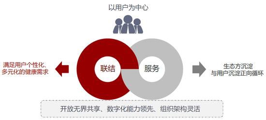 我们认为,医药产业的特殊性代表着高度复杂性,生态型企业在满足C端用户个性化全生命周期健康需求的过程中,需要有着强联结力,与各生态方形成开放的网络结构合作模式。同时,也需要借助领先的数字化能力,更好服务各生态方,最终使得生态方与C端用户的沉淀形成正向循环关系,在数字健康时代具备更强的数据沉淀能力。