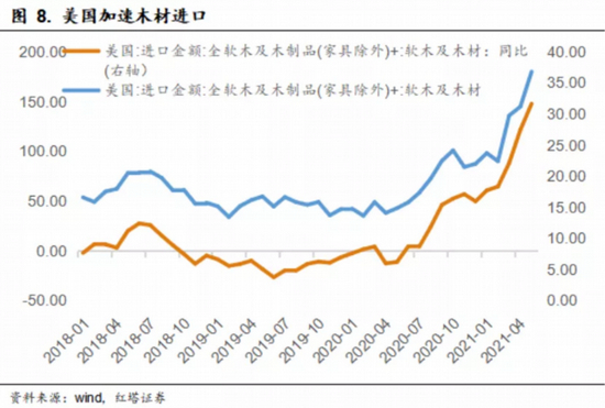 先来看进口,因为国内木材生产恢复慢,美国明显加快了进口木材等相关产品的步伐,可以看到,软木及相关制品的进口规模在2020年下半年以来快速走高。与此同时,美国在2020年11月宣布降低对大多数加拿大软木生产商征收的反补贴和反倾销关税,平均税率从20%以上降至平均值8.99%。