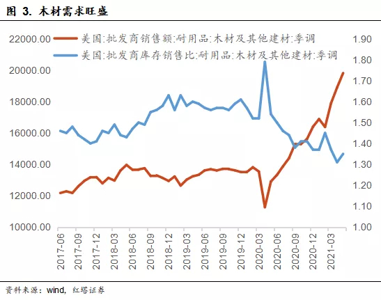 需求端的原因比较简单,因为美联储“直升机撒钱”,居民收入不跌反涨,叠加在家办公,居民的购房意愿提高,从而带动木材需求走高。