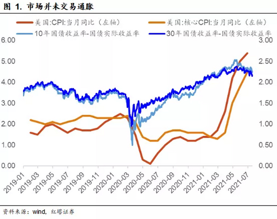 但是从资产交易上看,美国10年和30年国债隐含的通胀预期(国债收益率-实际收益率)自5月以来,一直在震荡下行,市场通胀预期有所回落。