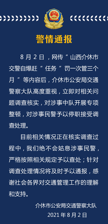山西介休市交警自曝“赶任务,罚一次管三个月”等内容,引发关注。