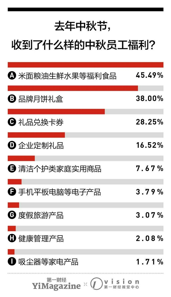 值得注意的是,包括带有企业个性的品牌月饼礼盒、企业定制礼品等产品逐渐占据主流,有超过54%的受访者都收到了这样的中秋福利。
