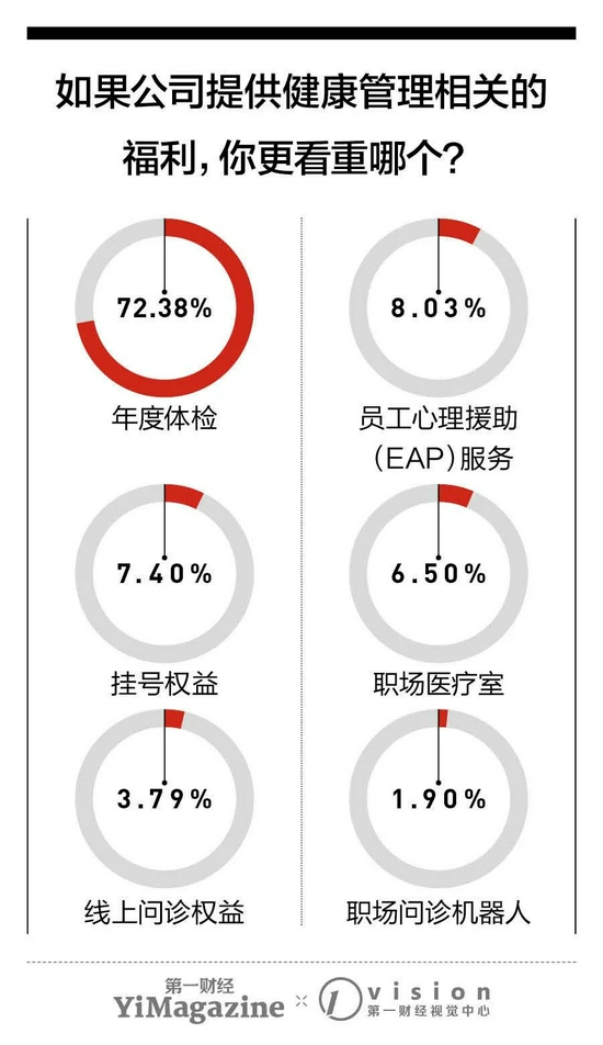 相应的,企业也在扩充健康管理相关福利。京东健康推出企业销售业务后,不少企业为员工采购线上问诊企业包,让员工可以免费通过互联网医院咨询健康问题。一些企业还会储备常用药,设立职场医疗室、中医理疗室等专业场所,让企业人在忙碌工作之余,还可以在有需要的时候照顾身体、管理健康。