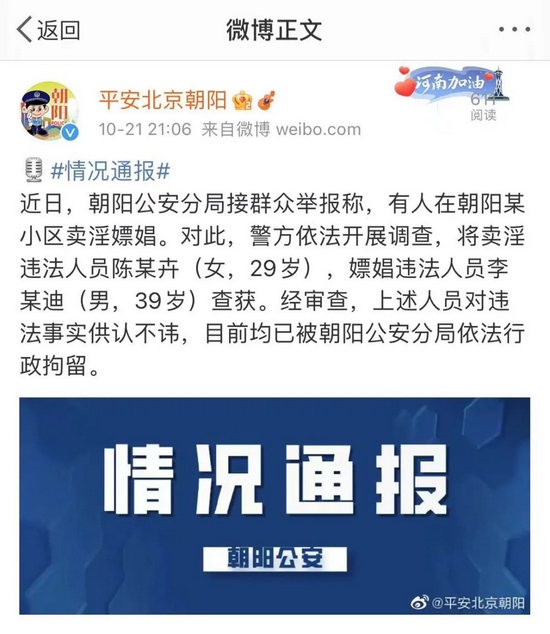 10月21日晚,李云迪嫖娼被行政拘留一事,引爆网络。北京警方发布通报:近日,朝阳公安分局接群众举报称,有人在朝阳某小区卖淫嫖娼。对此,警方依法开展调查,将卖淫违法人员陈某卉(女,29岁),嫖娼违法人员李某迪(男,39岁)查获。经审查,上述人员对违法事实供认不讳,目前均已被朝阳公安分局依法行政拘留。