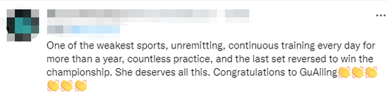 然而,她“坚持不懈,每天连续训练长达一年多,无数次的练习,最后一盘逆转赢得冠军。 这是她应得的。祝贺谷爱凌。 ”