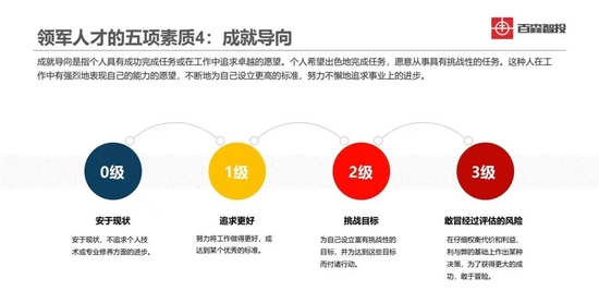 成就导向是零级的人一般会安于现状,而不追求更多的进步;成就导向是一级的人追求更好,往往能有不错的表现,能达到上级的标准;成就导向是二级的人会自设富有挑战性的目标,不需要上级驱动,他们自己有一套更高的标准和要求,而能达到这一层的人已经非常稀缺;成就导向是三级的人会仔细权衡代价和收益,敢于冒险作出某种决策,这是企业家的特质之一,也是职业经理人和企业家的天然鸿沟。