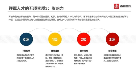 影响力是零级的人不能清楚地表达,说服不了别人,不能对他人产生有效影响;影响力是一级的人会试图用直接说服的方式,让别人接受自己,在过程中能够讲道理摆事实去争理,试图让人信服;影响力是二级的人会换位思考,用别人的话去解决别人的问题;影响力是三级的人用的是综合策略,自有一种智慧让别人接受自己的观点,这种人天生就有当领袖的潜质。