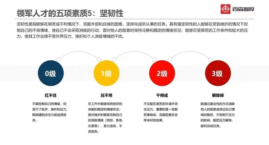 坚韧性三级的人则可以通过建设性的方式消除危机,不受制于压力。对于一个一把手来讲,不断地把困难克服掉、解除掉,这个企业就长大了。反过来也有一把手达不到三级,那么企业就沉淀在了天花板上。
