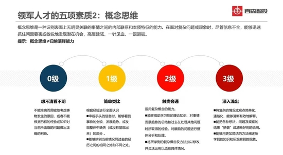概念思维是零级的人不会准确而周密地思考问题,对不确定的事物想不明白、看不清楚;概念思维是一级的人可以进行简单的类比,即能根据以往的经验对不确定的事物做出判断;概念思维是二级的人能做到触类旁通,能够总结规律去推论没做过的事情该怎么做;概念思维是三级的人懂得深入浅出,不仅能一针见血地把握要害,还能把复杂的东西极简化,让普通人都能理解,这其实是非常难的事情。