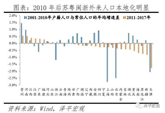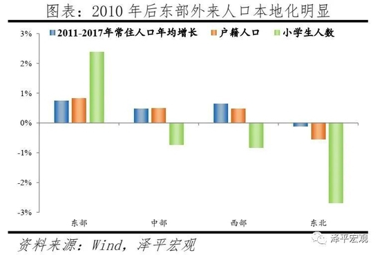 2010年左右以来,部分人口回流中西部,东部地区面对用工压力主动推进大学毕业生、技能人才等外来人口本地化,户籍人口和小学生增速明显加快,东北地区人口加速流出。2009年在长三角和珠三角地区务工的外出农民工占全国外出农民工比例分别比上一年下降2.4%和7.6%,2009年下半年东部沿海地区出现明显的“用工荒”;2013-2017年高校毕业生在东部地区就业规模虽持续增长,但占比从65.7%降至56.7%(参见麦可思研究院《中国大学生就业报告》)。面对用工压力,东部地区主动深化户籍制度改革、吸引外来人口安居乐业。2011年起以鞋服产业闻名全国的晋江在福建率先实行零门槛“居住证”制度,并于2013年率先实行“无房也落户”政策。在2014年国务院要求进一步推进户籍制度改革后,2015年福建宣布全面放开除福州、平潭、厦门外地区的落户限制;广东宣布,除广州深圳外,放开直系亲属投靠,放宽大专以上(含大专)学历毕业生及技能人才、特殊专业人才入户条件等。2011-2017年,东部、中部、西部、东北地区常住人口分别年均增长0.74%、0.48%、0.63%、-0.1%,常住人口占比分别变化0.6、-0.1、0.2、-0.3个百分点。尽管东部地区常住人口增长率明显下降,但其户籍人口和小学生增长率却不降反升。2011-2017年,东部、中部、西部、东北地区户籍人口分别年均增长0.82%、0.5%、0.48%、-0.54%,户籍人口占比分别变化0.7、0、-0.1、-0.6个百分点。东部、中部、西部、东北地区小学生数分别年均增长2.38%、-0.72%、-0.83%、-2.69%,小学生数占比分别变化5.2、-2、-2.2、-1个百分点。其中,2014-2017年东部地区在常住人口年均增速较2011-2013年下降0.02个百分点,但户籍人口年均增速反而上升0.22个百分点。