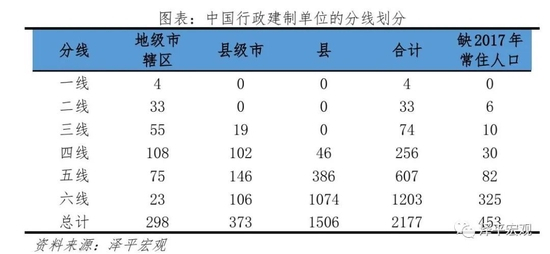我们在《中国人口大迁移》中将当前337个地级及以上行政单位划分为一二三四线城市。为更准确把握人口流动,本文以地级以上城市市辖区、县、县级市为基本单元,把中国内地2850个县级行政单位(不含福建省金门县)进一步细分为2177个地区,并依据GDP、政治地位、常住人口等因素划分为一二三四五六线城市。由于重庆市辖区范围太大,我们将其特殊处理为主城九区和非主城九区市辖区两部分,这使得地级及以上城市市辖区增加1个至298个。