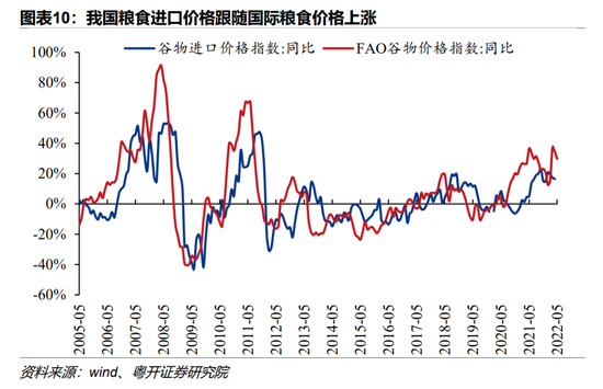 从贸易角度看,一是国际粮价上涨直接抬升粮食进口价格,国内自给率偏低的品种面临联动涨价压力。根据海关总署统计,我国进口谷物价格的同比涨幅同国际谷物价格相关性高,类比2008年、2011年,今年国际粮价大涨,也将带动国内进口粮食成本大增。除了谷物之外,我国大豆、油料和植物油的进口依赖度较高,国际粮食危机会加大我国部分饲料粮和植物油品种供需缺口,加大联动涨价压力。