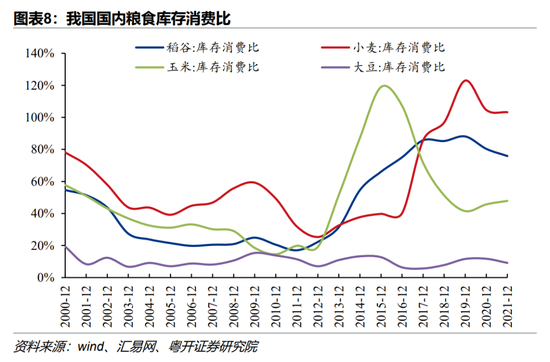 3、国内粮价波动率低于国际粮价。一是收储政策能够降低粮价波动。我国自2004年开始建立稻谷、小麦最低价收购制度,在国际粮食市场发生重大变化时,能够保证粮食供应,稳定市场预期。二是高库存对粮价稳定起到压舱石作用。政府收储积累了大量库存,2021年末小麦、稻谷、玉米的库存消费比分别为103%、76%、48%,均远远高于17%的国际警戒水平。