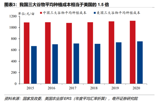 2、国内粮食价格通常高于国际粮价。一是我国粮食种植成本高于农业发达国家。2020年度国内三大谷物平均种植成本达到每亩1100元,是美国种植成本的1.5倍,高成本带来了高粮价。二是粮食进口配额保护国内市场,为国内粮食市场筑起了一道防火墙,避免了国际低价粮食的进口冲击。