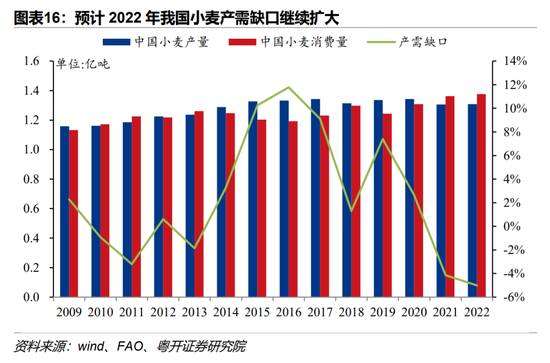 预计小麦价格年内上涨空间较大。一是今年夏粮收获产量或不及预期。去年受到夏季暴雨、秋季阴雨干扰,河南、山东、河北等黄淮海粮食主产区冬小麦晚播,并导致大面积苗情较弱,今年小麦夏粮收获或不及预期甚至出现减产。二是国际形势制约进口,小麦供需紧平衡形势下价格弹性增大。全球粮食危机导致国际粮食贸易市场紧张,国际粮价高企导致进口量收缩。联合国粮农组织预测,2022年度国内小麦进口量和产量双双下滑,国内小麦供需紧平衡。三是市场惜售情绪严重,小麦价格看涨。今年国内小麦收购价突破每斤1.5元,市场价大幅高于最低收购价。而预计2022年国内主产区小麦托市收购启动的难度较大,致使种粮农民惜售与囤粮等现象仍将持续,市场价格继续看涨。