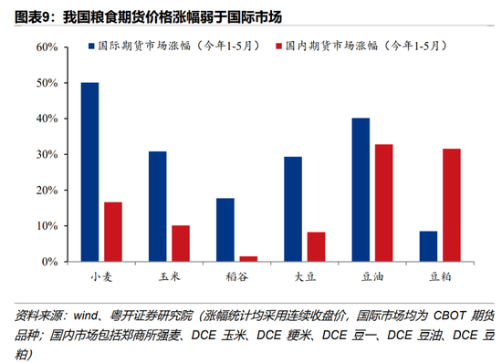今年国内市场粮食期货品种价格跟涨明显,但国内涨幅整体低于国际市场。国际粮食期货大涨会通过预期传导,并且不同粮食品种之间也具有联动效应。今年以来,截至5月底,国内大米期货价格累计上涨1.5%,远低于国际稻谷期货的涨幅;国内玉米、小麦、大豆期货价格涨幅小于国际,而油料、饲料用的豆粕品种价格涨幅相对较大。