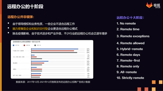 在远程办公这个话题上,极狐(Gitlab)创始人兼CEO陈冉及其核心团队是很好的分享者,他们公司从成立起,就没有设一个严格意义上的物理办公室,他们的团队有130多个人,分布在20多个城市和地区,不同职能、不同地区、不同时区的人如何共同创造一个产品,建立一个组织,这是一件非常有意义的事情。