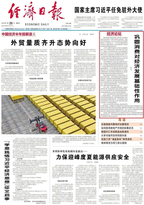 今年上半年,我国经济克服超预期因素不利影响,呈现企稳回升态势,尤其是二季度实现了经济正增长,稳住了经济大盘,成绩来之不易。上半年经济怎么看?下半年经济怎么办?经济日报头版连续刊发5篇金观平评论文章,回应热点问题。