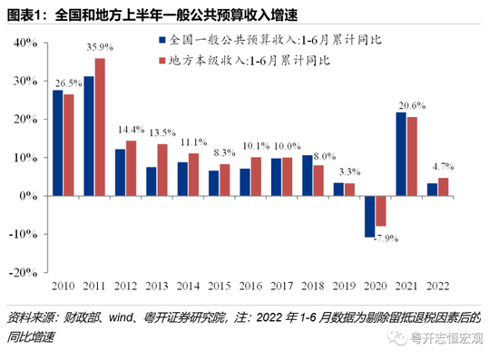 上半年,中国31省份一般公共预算收支差均为负,紧平衡压力加大。总理李克强指出东南五省财政收入占比近4成,在地方对中央财政净上缴中贡献近8成,有力支撑了国家财力和中央财政对中西部地区转移支付;但是今年中西部资源型省份的财政收入增速远高于东部地区,中西部地区财政收入占比上升。如何看待当前的财政形势和区域分化新特征?如何认识资源型省份增速居前与东南省份挑大梁的作用?中国财政今年上半年同时面临减收与增支,背后一方面是疫情反复、地产走弱、俄乌冲突等复杂严峻的国内外局势,另一方面是政策性减税降费退税以及加大支出力度对冲经济下行。中国财政正处于总体紧平衡、部分地区较为困难的阶段,各方面压力与考验较大。随着疫情边际缓解和前期政策发力,中国经济将在三季度开始逐步回升,同时由于增值税留抵退税集中在上半年,下半年财政收入形势可能好于上半年。但是,当前经济恢复的基础不牢固,下阶段疫情不确定性仍存,房地产市场和投资低迷等因素导致财政收入仍有压力。同时,财政还被寄予稳定经济大盘的厚望,压减支出的空间较为有限,收支矛盾不易缓解。从下半年来看,一是要发挥中央和地方两个积极性,积极支持经济大省“稳大盘”“挑大梁”“复元气”,为国家财力提供保障。二是引导地方把有限的财政和债务资金用到刀刃上,既要保障疫情防控、托底基层“三保”,又要提振国内消费、扩大有效投资。三是注重呵护现金流量表受损的企业和居民部门,减轻市场主体负担,做好住房市场风险处置,避免引发新的经济、金融、社会风险。从长期看,还要加快推进地方财政体制改革,坚持激励与约束并重,增强地方财政体制的适应性和有效性。一、上半年地方财政形势呈现四大特征(一)受疫情冲击和留抵退税的影响,地方财政收入总体表现低迷财政“半年报”显示,上半年全国一般公共预算收入按自然口径计算下降10.2%,扣除留抵退税因素后增长3.3%。其中,地方收入按自然口径计算下降7.9%,扣除留抵退税因素后增长4.7%。虽然地方收入可比口径增速高于2019、2020年同期,但与2012-2018年10%左右的增长中枢相距甚远。