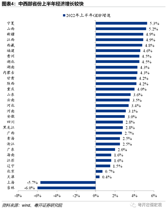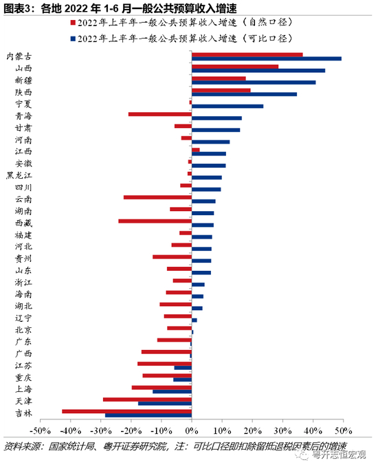 今年以来,经济总体表现与区域分化异于常年,西部地区受益于资源价格上涨,东部地区受困于疫情冲击。上半年,中西部GDP和地方财政收入(可比口径)分别同比增长3.8%、15.1%,较东部高出2个、16.1个百分点。地方财政收入比重“西升东降”,东部、中西部、东北占比从2021年上半年的59.4:35.9:4.5变为今年上半年的56.9:39:4.1。分省份来看,内蒙古、山西、新疆3个资源大省财政收入可比口径增速超40%,分列全国前三位,且增速前10名省份全部位于中西部地区。负增长的7个省份中不乏东部大省,其中上海、江苏、广东分别下降12.9%、5.8%、0.5%。