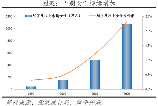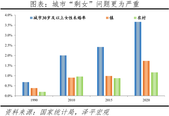 2)因婚姻市场匹配问题及单身主义等,“剩女”规模快速增加至约600万,学历越高“剩下”的概率越大。在婚姻市场中,女性多偏好不低于自身条件的男性,男性多偏好不高于自身条件的女性。这意味着即便婚姻市场男女性别比平衡,条件最好的女性和条件最差的男性也最有可能被剩下。1990年中国30岁及以上未婚女性仅为46万,2000年超过154万,2020年攀升至1042.4万;其中,30-34岁女性未婚率从0.6%攀升至9.3%。从城乡分布看,2020年城市30岁及以上女性未婚率为3.7%,明显超过建制镇的1.7%、农村的1.2%。从受教育程度看,2020年30岁及以上研究生学历女性未婚率高达14.4%,远高于本科学历及以下女性未婚率的1.8%。