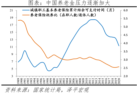 人口老龄化使得社保收支矛盾日益凸显,养老金缺口将日益增加。2021年中国社会保险基金收支结余4459亿元,剔除财政补贴后的实际盈余约为-1.49万亿元,连续9年为负。养老保险在社保体系中占比约67%,2021年城镇职工养老保险基金实际盈余为-5353亿元,实际盈余连续9年为负。当前社保缺口主要在于历史欠账,即计划经济时代国企办社会,部分人群未在退休前缴纳保险费,但享受养老金发放福利。2017年11月国务院发布《划转部分国有资本充实社保基金实施方案》,要求2020年底之前划转企业国有股权的10%补充社保。但随着人口老龄化程度不断加深,养老金缺口将日益凸显,这也是全球面临的普遍难题。从中国城镇职工基本养老保险基金看,中国累计结余可支付时间从2012年的18.5个月逐渐下降至2020年的11.3个月,抚养比(在职人数/退休人数)降至2.57。2020年有25省入不敷出,20个省的累计结余可支付时间在12个月以下,7个省的抚养比已降至2以下;其中黑龙江养老保险基金从2013年开始持续“入不敷出”,2016年累计结余转负。并且,随着老龄化加剧,医疗支出压力也将越来越大。根据国家卫生服务调查,2003-2018年中国调查地区居民两周患病率(患病人次数/调查人数)从14.3%增至32.2%;其中65岁及以上人口患病从33.8%增至58.4%,2018年老年人口的患病率是平均水平的1.8倍。