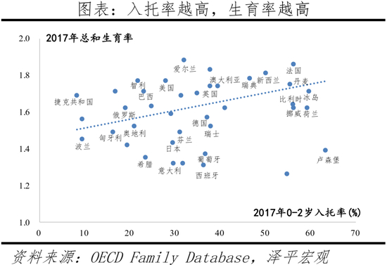 3)完善的儿童托幼服务体系,法国2017年0-2岁入托率达56.3%,远高于OECD水平。法国的儿童托幼服务体系齐全,包括:集体托儿所等集体接待机构、幼儿园助理等家庭接待机构;保姆等家庭看护、“娱乐接待员”等。无论采取哪种方式,法国家庭津贴基金(CAF)都会提供资助,如请保姆到家中照顾孩子,雇主最少仅需出15%的费用。根据OECD数据,2017年法国0-2岁入托率为56.3%,在所有OECD国家中排名第四,高于OECD平均水平的35%。