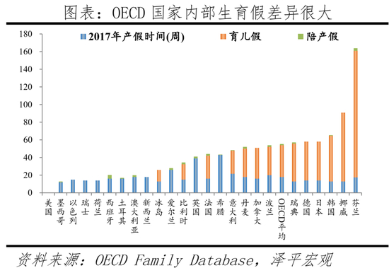 但女性休假长度和生育率高低相关性很弱,其中原因在于延长女性休假时间与保障其就业权益存在一定矛盾。产假过长可能会让女性在职场中面临更大的歧视和排斥,提高就业门槛、降低职业升迁机会。如德国的女性生育总假期长度为42.6周,但2017年总生育率仅为1.57;而英国的总假期长度为11.7周,但总和生育率为1.79。因此,保障女性休假必须与规范劳动力市场、加强女性劳动权益保障、完善父亲陪产制度的举措同步推进。如法国有14天男性陪产假,瑞典、法国和德国父母双方可共享育儿假。完善父亲生育休假制度既鼓励夫妻共同承担家庭事务和育婴责任,也一定程度上缩小男女性在生育问题上受到的影响程度。