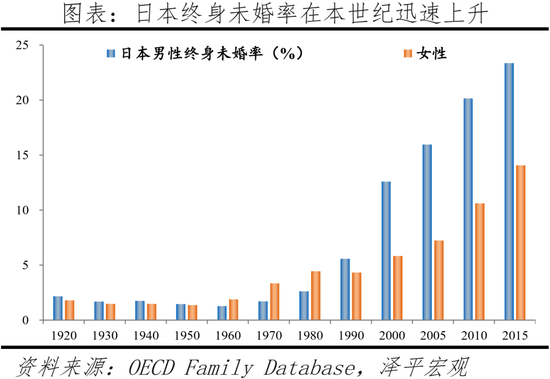 三是日本“男主外、女主内”性别分工较为普遍,职场性别歧视严重越来越多日本女性放弃结婚生育,1990-2015年50岁以上女性终身未婚率从4.3%激增至14.6%。与芬兰、瑞典等国将部分育儿养老工作社会化并由国家承担不同,日本的育儿养老责任多由家庭女性承担,将女性的角色定位为全职家庭主妇的思想仍然存在,“男主外、女主内”思想较为普遍。根据世界银行,2019年日本的女性劳动参与率达51.4%,低于OECD平均的51.5%;2019年日本男女劳动参与率差距达19.0个百分点,高于OECD平均的16.8个百分点。根据OECD数据,2018年日本的男女就业率差距为14.3个百分点,高于OECD平均的11.1个百分点;2016年日本的全职员工中男性和女性的收入中位数差距为24.6%,高于OECD国家13.5%的平均水平。越来越多的日本女性选择(暂时)放弃家庭,进入职场。根据日本国立社会保障和人口问题研究所,1990、2010、2015年男性终身未婚率分别为5.6%、20.4%、23.4%,女性分别为4.3%、10.6%、14.6%。日本社会已形成了一种不愿结婚和生育的观念,积重难返。