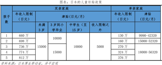 在经济补贴方面,日本生育女性可获得42万日元的一次性生育临时金、以及每月约1万日元的儿童补贴(12岁以下)。日本女性生产可以获得42万日元的一次性生育临时金,养育儿童可获得儿童补贴。在收入限制内、抚养一个三岁以下的孩子的家庭,每个月可以获得15000日元的儿童补贴;抚养3岁到小学毕业的孩子的家庭,有2个孩子以内的每月可获得10000日元,3个孩子及以上的每月可获得15000日元等。