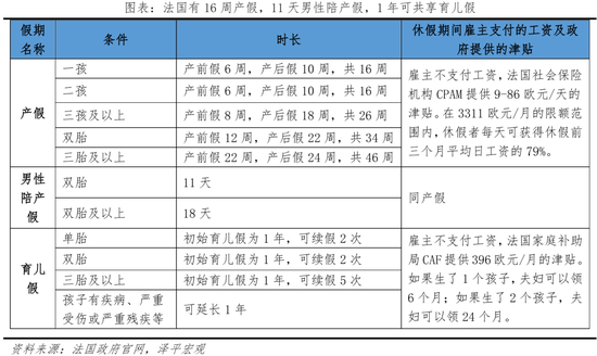 法国主要采取了以下措施:1)保障假期,设置16周产假、11天男性陪产假和1年的夫妻共享育儿假。根据法国政府官网,目前法国设置了16周产假,包括产前假6周和产后假10周。产假期间雇主不提供工资,但法国社会保险机构(CPAM)会提供9-86欧元/日的津贴。具体金额取决于休假者的工资。法国有11天的男性陪产假,期间可获得和产假一样的每日津贴。法国还设置了1年的育儿假,夫妇可共享。续假只需提前一个月向雇主申请,雇主不能反对。育儿假期间雇主不支付工资,法国家庭补助局(CAF)会提供396欧元/月的津贴。